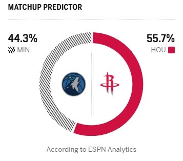 今日ESPN晒出本场胜率预测,火箭为55.7%,森林狼只有44.3%。